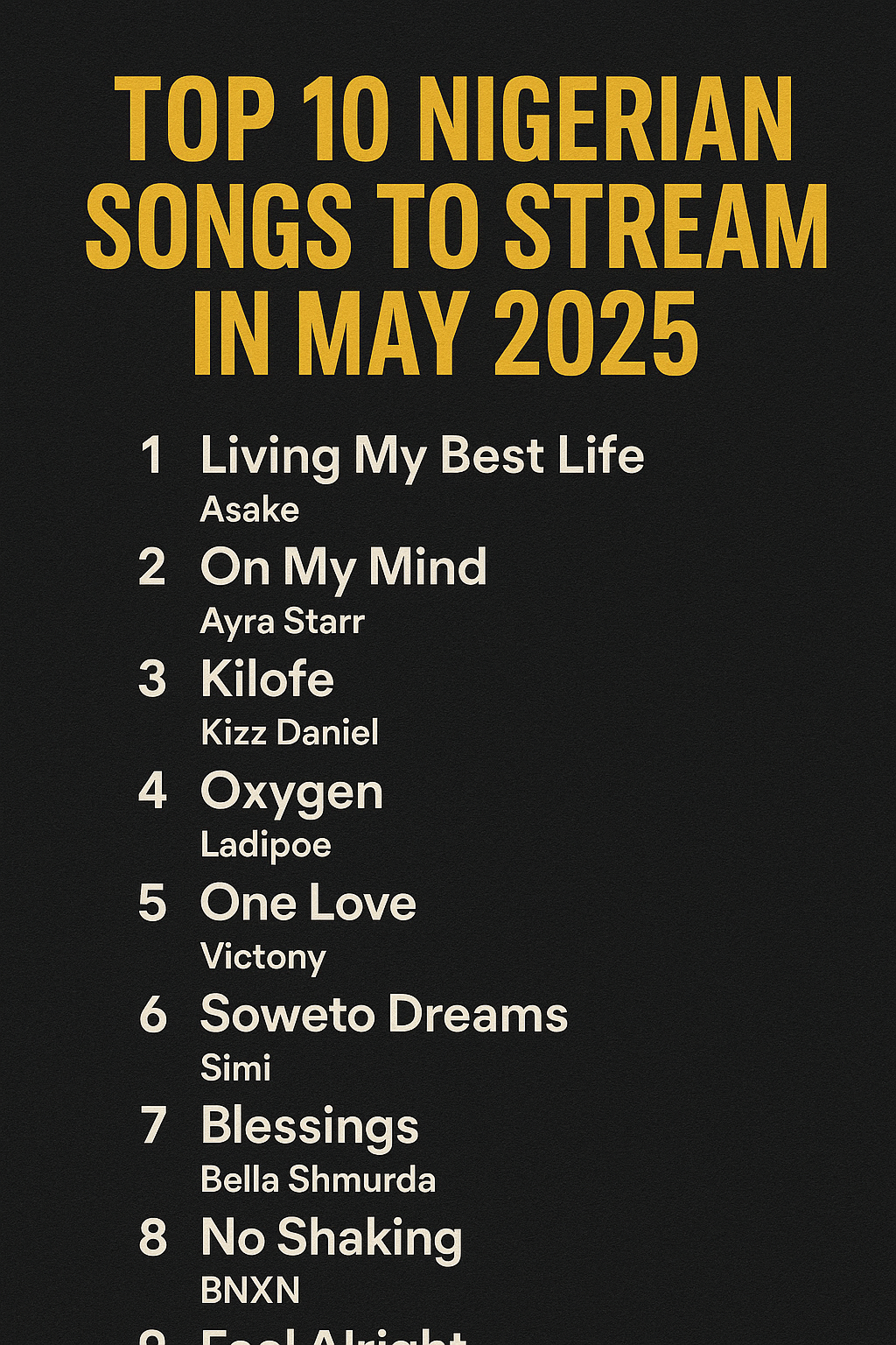 These are the Top 10 Nigerian Songs to Stream in May 2025 — based on social buzz, playlist rankings, club rotation, and viral trends.