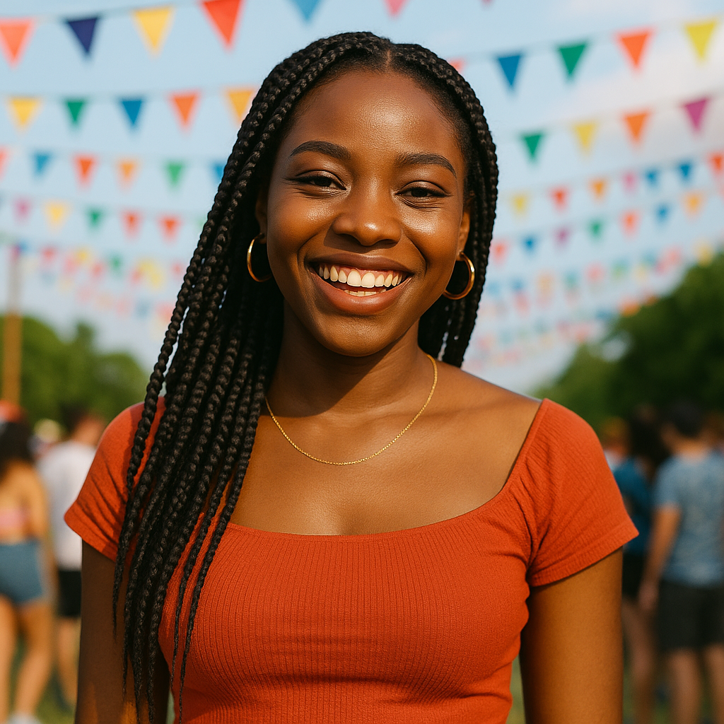 The image for this article — featuring a smiling young woman standing under colorful festival flags — perfectly captures the cheerful, warm, and vibrant vibe that defines daytime festivals today.
